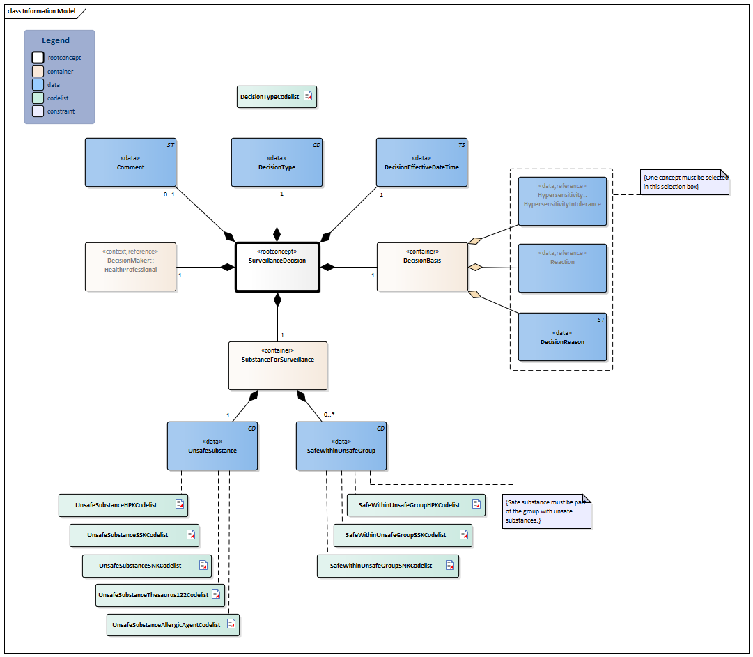 The zib SurveillanceDecision represents the health professional’s decision to start or end surveillance of a substance or group of substances. Initiating surveillance means that the health professional wants to receive a warning if an unsafe substance is prescribed. The DecisionEffectiveDateTime represents the moment at which surveillance should start or end, depending on the DecisionType (started or discontinued).